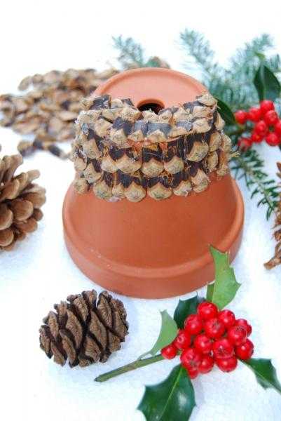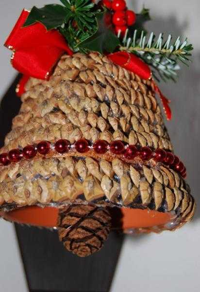 Внимание! Не отрезай кончик веревки внутри горшка: чтобы колокольчик выглядел более естественно и изысканно, из небольшой шишки, приклеенной к веревке, сделай ему язычок.