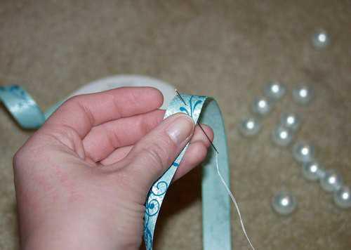 3. Возьмите бусинки и проденьте их ниткой. Две соседние бусинки должны располагаться по обеим сторонам ленты.
