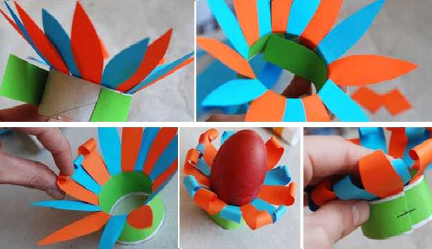 Эти подставки для яиц сделаны из рулона от туалетной бумаги и полосок цветной бумаги.