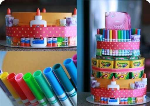 Эти мелкие школьные принадлежности любят все детишки, однако они часто их теряют, меняют и дарят, поэтому канцелярских принадлежностей никогда не бывает много. Их можно покупать и дарить ребенку на протяжение всего учебного процесса. А чтобы подарок понравился наверняка, нужно соорудить из карандашей, клея, скрепок, красок яркий торт.
