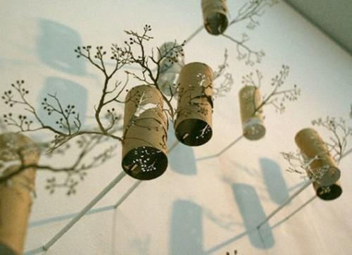 Не намного сложнее соорудить светильник из втулок, только важно помнить о том, что бумага не любит сильного нагрева, поэтому лампочки следует использовать светодиодные.