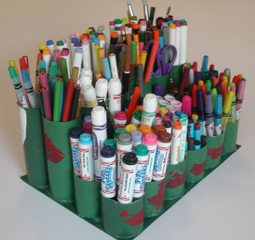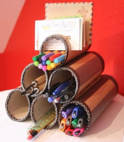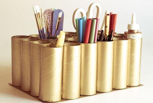 Подкопив немного втулок, можно смастерить стильный органайзер для канцелярских принадлежностей или оригинальную подставку для косметических кистей, карандашей и туши для ресниц. Варьируя высоту миниатюрных хранилищ, вы легко получите индивидуальный аксессуар, вмещающий все, что необходимо.