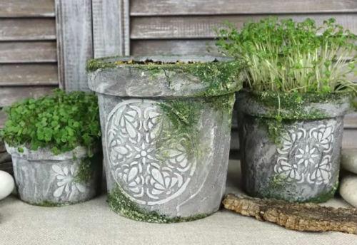 После полного высыхания, поверхность горшочков ошкуриваем нождачкой (маркировка 200), чтобы удалить острые кусочки засохшей пасты. Образовавшуюся пыль на поверхности сметаем кисточкой. Снова разводим пасту с черной краской до оттенка светлее, чем сама основа и с помощью специального трафарета на каждый из горшочков наносим рельефный элемент. Для удобства трафарет закрепляем малярным скотчем. Пока паста свежая убираем излишки, если таковые образовались. После 2-часового просыхания, узор шлифуем нождачкой и убираем пыль. Пришло время наносить имитацию мха. Смешиваем пасту с оттенками зеленого (предложенными выше), добиваясь желаемого цвета мха. Наносим краску в нужные нам места, подсушивая их теплым воздухом фена. С помощью губки как бы оттягиваем краску от поверхности. Даем каменным горшочкам сутки, чтобы просохнуть и можно приступать к посеву рассады.