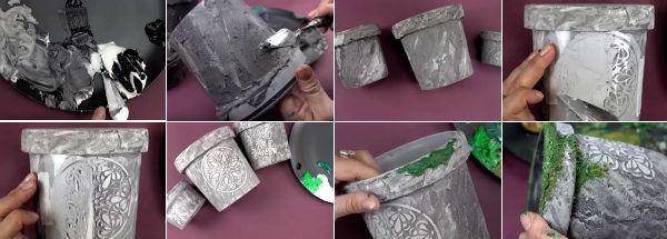 На тарелку выкладываем рельефную пасту в трех порциях. Чтобы получить оттенки серого (темный, средний и светлый) в каждую из порций добавляем черную краску в разном количестве. Готовую пасту наносим на поверхность ведер (см. видео). Далее губкой для посуды, штампующими движениями придаем поверхности текстуру, не делая поверхность гладкой и ровной, а наоборот оставляя бугорки, неровности, перепады высот на основе. Не забывайте чередовать оттенки серого цвета. Даем горшочкам сутки, чтобы высохнуть.