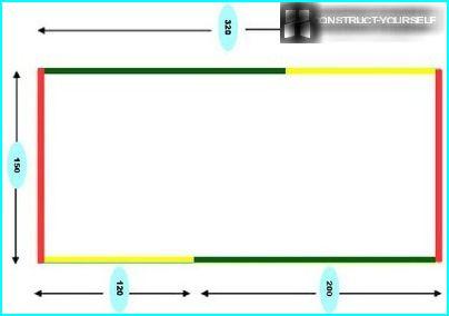 Отрезы прострачиваются с двух сторон вдоль длины выкройки навстречу друг другу. Длина строчного шва 2 метра. В итоге образуется тоннель с недостроченными краями. Участки выкройки, отмеченные на чертеже желтой чертой, не сшиваются.