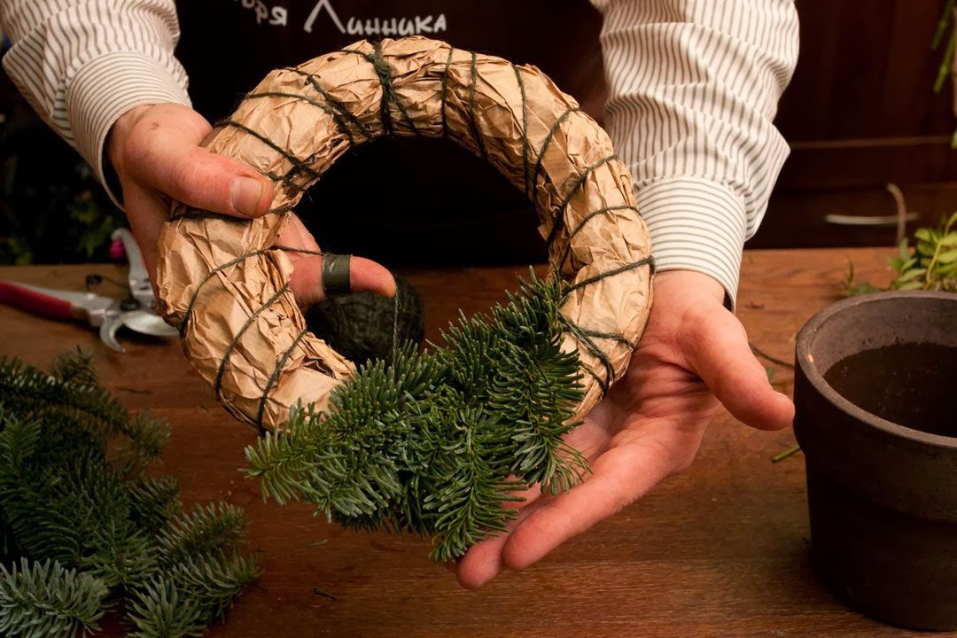 Сначала к основе необходимо присоединить ветки ели, которые следует заранее разрезать секатором на небольшие части. С помощью проволоки они фиксируются к основе. После того, как обмотка ветками будет завершена, проволока завязывается на узел.