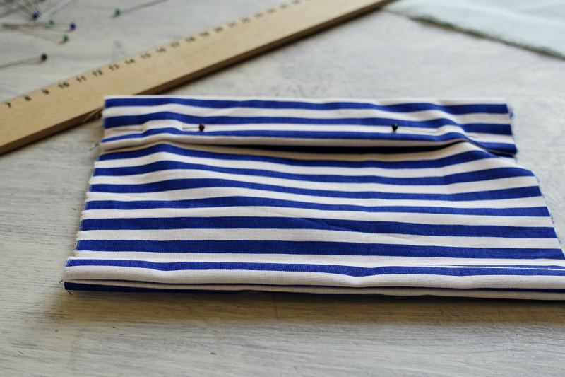 - Сделайте три вкладки, закрепите их булавками. Сначала сложите около 5 см от края.
