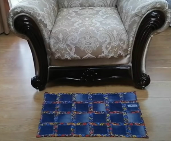 Наш коврик почти готов, осталось простегать его по краям джинсовых квадратиков: они должны получиться выпуклыми и красивыми. Теперь нижнее полотно плотно прилегает к синтепону и даже чисто внешне коврик стал красивее и фактурнее. Если вам нужен ковер большего размера, то следует добавлять количество квадратов, а не их размер. Можете проявить фантазию и варьировать цветовой гаммой, в том случае, когда вы используете лоскуты из разных тканей по цвету и структуре.