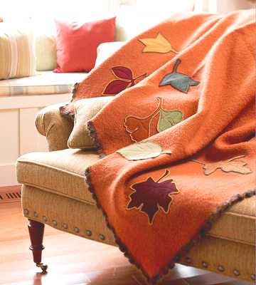 Это "осеннее" одеяло и красивое, и практичное - вы можете использовать его и по его прямому назначению, и как покрывало для дивана, кресла или кровати. Такое одеяло можно сделать «с нуля», используя мягкую ткань «осеннего» тона, или использовать для этой цели старое одеяло, желательно однотонного цвета, чтобы обновить и освежить его, добавив украшение.