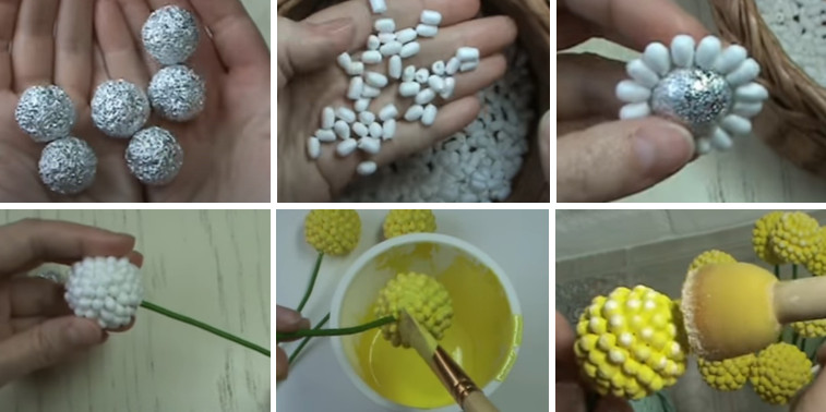 Переходим к покраске соцветия. Для этого мы будем использовать белую акриловую краску с добавлением желтого. Полностью окунаем соцветие в краску и с помощью кисти убираем все излишки. У нас получились замечательные цветы краспедии. Отправляем их сушиться. После того, как цветы немного обсохли, с помощью губки, на соцветия, наносим немного белых бликов, но это по желанию. Таким способом мы сделали только несколько цветов, остальные же остались однотонными. По желанию композицию можно украсить блестками.