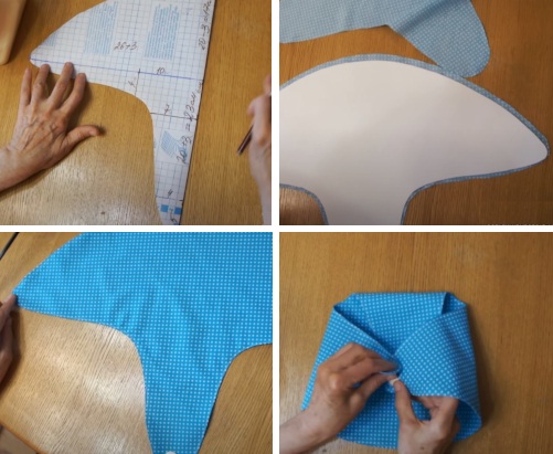 У нас готова половина выкройки, и если мы развернем лист, то получится целая заготовка для панамы. По готовой выкройке с небольшими припусками на швы 0,7-0,8 мм вырезаем две детали, складываем их лицевыми сторонами внутрь. Далее следует прострочить и оставить небольшое место для выворачивания изделия. Чтобы панама хорошо вывернулась, следует сделать надрезы, не доходя до шва 0,2 мм, через отверстие вывернуть, аккуратно зашить и прогладить.