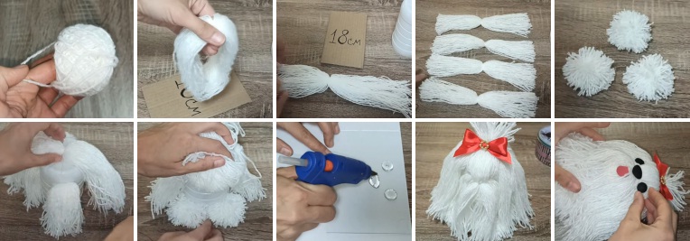 Приступаем к сборке собачки. 4 заготовки по 12 см, с помощью клеевого пистолета крепим к бутылке друг напротив друга, а самую длинную кисточку — 18 см фиксируем по центру. С помощью термоклея и ниток, закрываем просветы бутылки по бокам. В качестве лапок и хвостика послужат помпоны. Фиксируем 2 помпона спереди и 1 сзади. Хорошенько расправляем все ниточки, где нужно, подклеиваем, создаем, как говорится, собачке опрятный внешний вид.