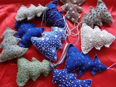Сначала рисуем на бумаге заготовки будущих игрушек и вырезаем их. Затем обводим шаблон на кусочках фетра и вырезаем по 2 одинаковых детали. Украшаем их декоративными элементами и сшиваем между собой петельным швом, прокладывая между ними небольшое количество синтепона или другого наполнителя. Не забудьте вверху игрушки аккуратно пришить ленточку.