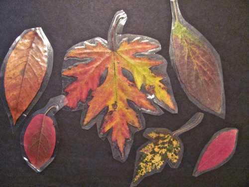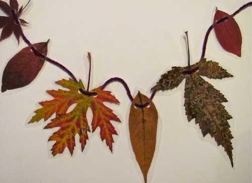 Осенние листья можно и заламинировать с помощью прозрачной самоклеющейся пленки, поместив листья между двумя ее слоями (липкая сторона — внутри), а затем просто вырежьте листочки по контуру. А проделав дыроколом в них дырочки, можно сделать осеннюю гирлянду и украсить дом.