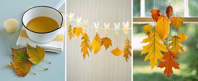 Например, из осенних листьев можно сделать вот такую подвеску (мобиль). А чтобы листья подольше на рассыпались, их можно предварительно погрузить в растопленный на водяной бане воск или парафин.