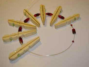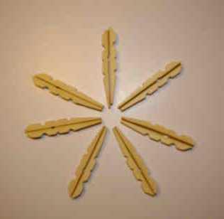 Сначала вам надо будет разобрать прищепки, сложить половинки обратной стороной друг к другу (см. фото), соеденить их (склеить, но можно и не соединять), а затем проделать в них отверстия на одинаковом расстоянии. Это - самое сложное при изготовлении звезд из прищепок.