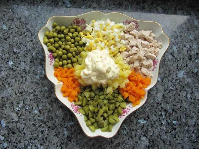 Всем известен рецепт такого салата, как "Оливье" (кто забыл - см. фото. На нем изображены все составляющие этого рецепта). И как бы мы к нему не относились, но представить без него новогодний стол очень не просто. Поэтому предлагаем вашему вниманию нетрадиционную подачу этого традиционного салата.