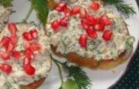 Перед подачей на стол, намазываем обжаренный батон толстым слоем охлажденной бутербродной массой и украшаем зернами граната и зеленью.