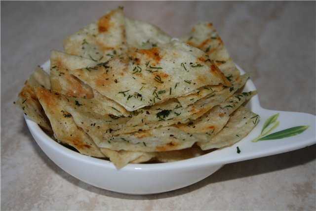 Ингредиенты: 1 тонкий лаваш, примерно 1/4 ч. ложки соли, 1,5-2 ст. ложки растительного масла, любые специи, приправы, зелень, чеснок по вкусу.