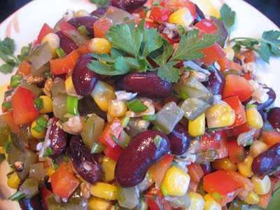 Ингредиенты: консервированная красная фасоль - 1 банка, консервированная кукуруза - 1 банка, перец болгарский - 2 шт., огурцы маринованные - 2 шт., грецкие орехи - 100 г, чеснок - 2-3 дольки, зелень петрушки, масло оливковое/растительное.