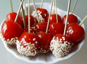 Как только карамель будет готова, быстро окунайте в нее помидорчики и посыпайте их кунжутом.