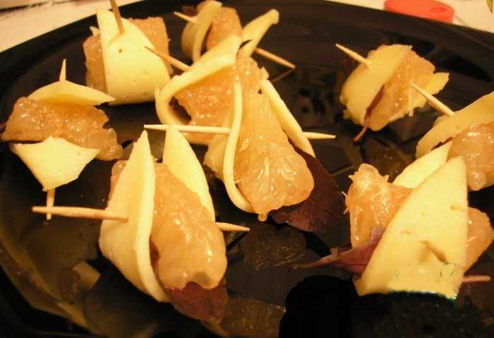 Ингредиенты: грейпфрут – 1 шт., кусочек твердого сыра или можно купить уже нарезанный, зубочистки, базилик или петрушка.
