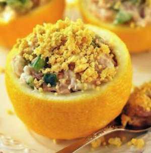 Теперь наполните лимонные чашечки рыбным салатом и посыпьте сверху тертым желтком.