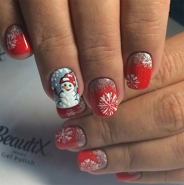 В Нового году приветствуются и тематические рисунки: снежинки, елочные украшение, олени, елки, петушок, дед мороз, конфеты и карамельные завитушки. Также отлично и празднично будут смотреться ногти с «полосатым» рисунком, например, сочетание красного и зеленого, или красного и белого. Тут в не стоит ограничивать себя в выборе.