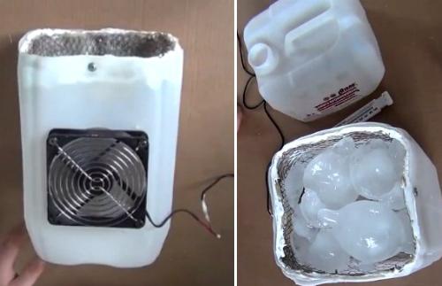 Поток воздуха, который будет подавать вентилятор вовнутрь, проходит через лед и выходит через верхнее отверстие уже холодным воздухом. Запускаем мини-кондиционер и наслаждаемся прохладой. За три минуты работы, подача воздуха составляет +13-14 градусов, при температуре +27 градусов в помещении. Образовавшуюся талую воду на дне, легко можно будет слить. Мы соорудили отличное устройство в виде кондиционера собственными руками, за короткое время и при минимальных затратах.