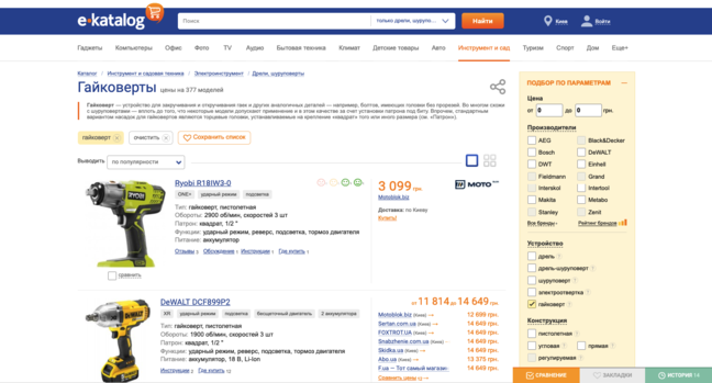 Чтобы купить электрический гайковерт максимально выгодно, можно отследить ценовую политику интернет-магазинов на сайте ek.ua. Таким образом удастся найти самый выгодный вариант.