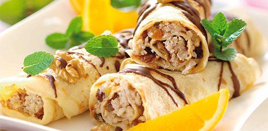 Для приготовления начинки грецкие орехи очистите, измельчите их, добавьте молоко, сахар и ром. Перемешайте и соедините смесь с изюмом и апельсиновой цедрой. Разложите начинку на блины и сверните их рулетиком или треугольником.