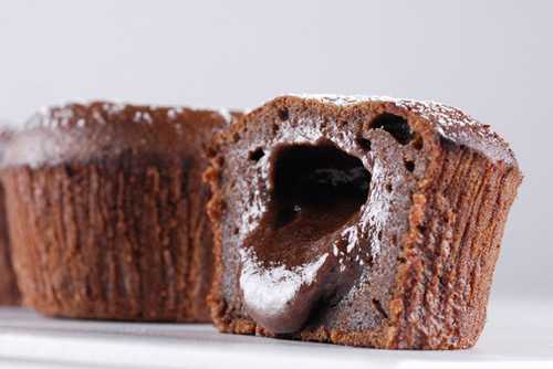 Приготовление: на водяной бане растопить масло, поломанную плитку шоколада и сахар, а затем отставить для охлаждения. Яйца слегка взбить вилкой и добавить в остывшую шоколадную смесь. Затем добавить ваниль и муку. Перемешать. Вылить смесь в промасленные и слегка посыпанные мукой формочки для кексов и поставить их на 1 час в холодильник, а затем испечь «шоколадные вулканы» в предварительно разогретой духовке при температуре 220 градусов. Выпекать 10-12 минут — пока не образуется твердая оболочка снаружи, а середина останется жидкой.