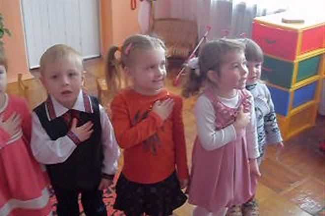 Как положено, четырехлетние дети держат правую руку на сердце и вместе с воспитательницей поют стихотворение Павла Чубинского.