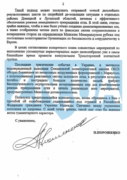 «Такой подход может послужить отправной точкой дальнейших результативных шагов по скорейшей деэскалации ситуации в отдельных районах Донецкой и Луганской областей, начиная с эффективного обеспечения режима немедленного прекращения огня. В связи с этим, считаю крайне важным, чтобы в нем было учтено создание демилитаризованных зон, а также отражены четкие шаги по фиксации линии соприкосновения и возврата сторон на определенные Минским Меморандумом рубеже под постоянным мониторингом Организации по безопасности и сотрудничеству в Европе», - говорится в обращении Порошенко.