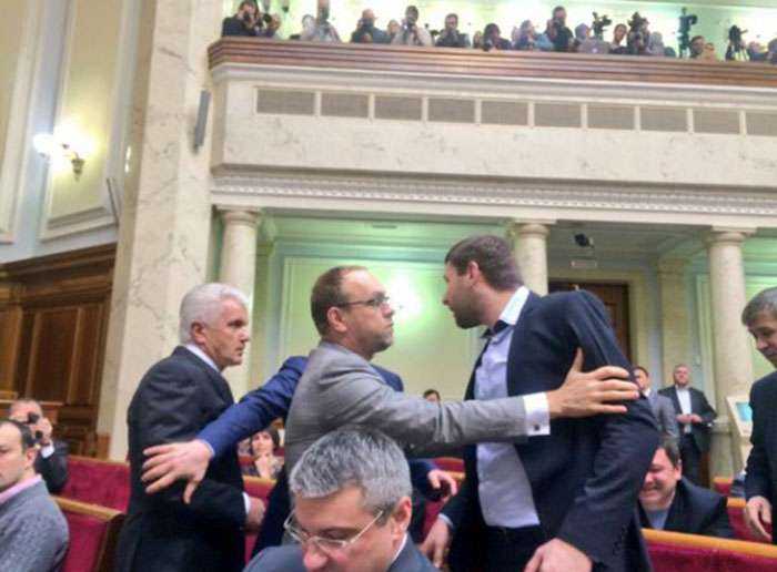 В сессионном зале между рядами его уже поджидал разъяренный Владимир Парасюк. Бывший сотник Евромайдана выбежал навстречу Владимиру Литвину и толкнул его в грудь обеими руками.