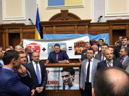 Два народных депутата вышли к трибуне с плакатом, на котором размещена надпись “Реванш Кремля” и изображены ряд народных депутатов, а также экс-Президент Виктор Янукович, экс-глава Администрации Президента Сергей Левочкин и бывший премьер Николай Азаров.