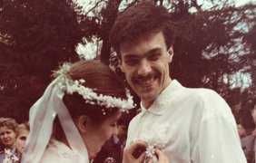 "24 года назад...", - написал Тягнибок в фейсбуке и разместил 5 фотографий. На них он оказался худощавым молодым человеком с усами. Его невеста, Ольга Тягнибок - чернобровой русявой девушкой в традиционном коралловом ожерелье и белом венке.