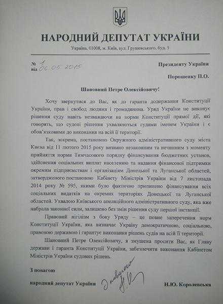 «Больше месяца назад Кабинет Министров второй раз проиграл дело о невыплате пенсий и социальных выплат на Донбассе. Есть решения судов, но нет выплат. Правительство по-прежнему игнорирует закон, люди бедствуют, голодают. Поэтому единственным выходом из ситуации я посчитала возможность обратиться к Президенту Украины - попросить его вмешаться в ситуацию и обязать Кабинет министров выполнять решения судов», - сказала Наталия Королевская.