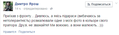 "Приехал с фронта. Смотрю, а какие-то п...расы (извиняюсь за нетолерантность) разрисовали одно из моих фото в цвета своего флага. Друзья, не обращайте внимания! Мы воюем, а они рисуют", - написал он.