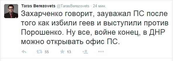 Лидер "ДНР" Александр Захарченко говорит, что зауважал "Правый сектор" после того, как они избили геев и выступили против Порошенко. Об этом на своей странице в twitter написал политконсультант Тарас Березовец.