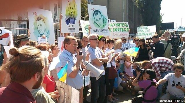 Открывая импровизированный митинг, украинский кинорежиссёр, сценарист, член-корреспондент Национальной академии искусств Украины Олег Фиалко заявил, что кроме требования к России освободить незаконно захваченных и осужденных украинских граждан в Крыму, необходимо предъявить претензии и к власти Украины, которая в течении 1,5 лет практически ничего не сделала для освобождения политических узников.