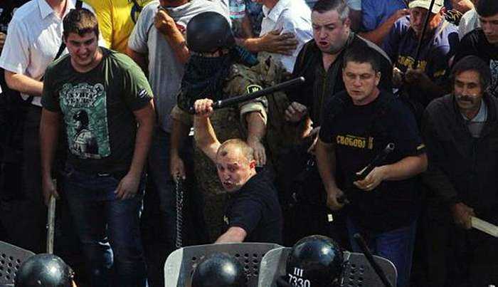 На фото видно, как экс-свободовец Юрий Сиротюк с резиновой палкой в руках прочищает коридор в парламент для радикалов с цепями, палками и металлическими трубами.