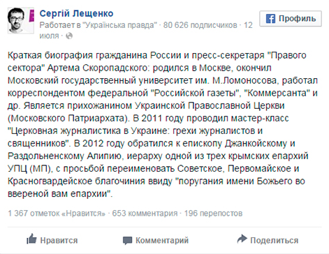 Народный депутат Сергей Лещенко сообщил на своей странице в Facebook краткую биографию пресс-секретаря «Правого сектора» Артема Скоропадского.