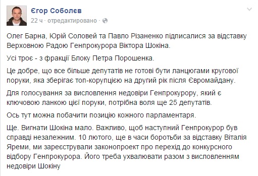 "Олег Барна, Юрий Соловей и Павел Ризаненко подписались за отставку Верховной Радой Генпрокурора Виктора Шокина. Все трое - из фракции Блока Петра Порошенко. Это хорошо, что все больше депутатов не готовы быть цепями круговой поруки, которая сохраняет топ-коррупцией на второй год после евромайдан.