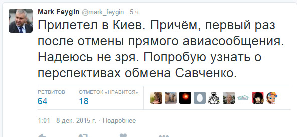6 декабря Фейгин написал, что группа адвокатов Савченко не даст вынести "суровый" приговор до Нового года.