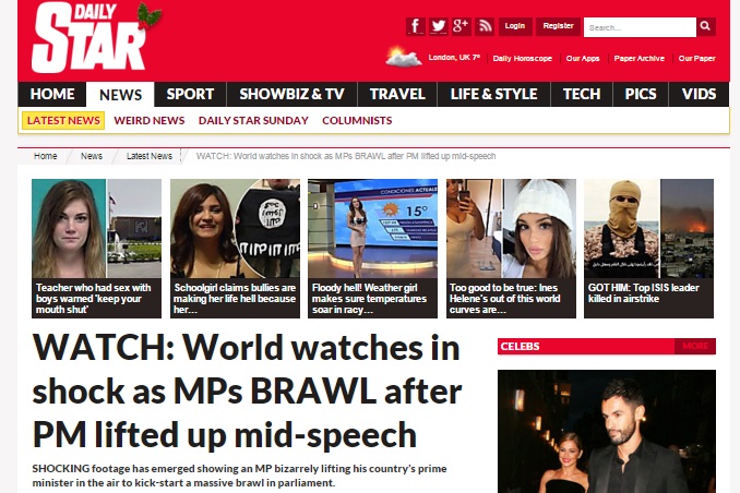 В Daily star видео с "причудливым подъемом" Яценюка и последовавшую за этим массовую драку в Раде, назвали "шокирующим".
