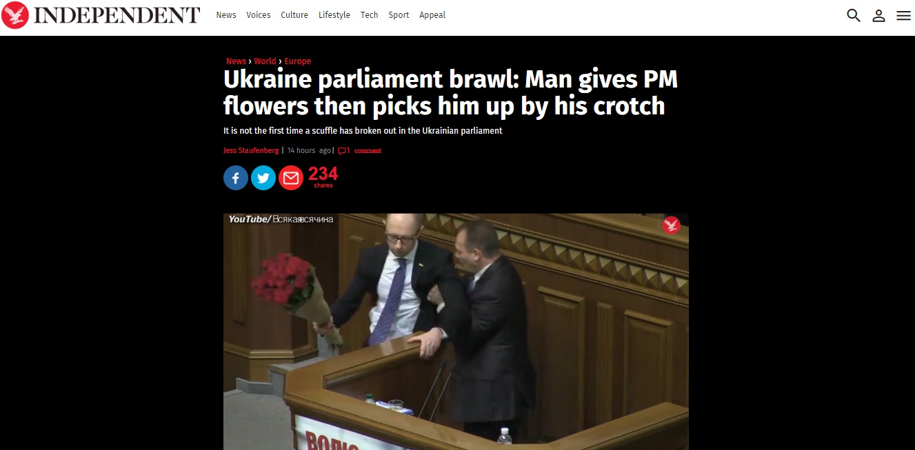 Вчерашний инцидент в Верховной Раде связанный с нападением депутата от БПП Олега Барны на премьер-министра Арсения Яценюка, не прошел мимо авторитетных мировых СМИ. Предлагаем вашему вниманию реакцию популярных еженедельников и мировых СМИ на произошедшую вчера драку в парламенте.