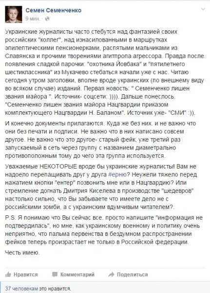 "Читаю сегодня утром заголовки, вполне вроде украинских (по внешнему виду во всяком случае) изданий. Первая новость: " Семенченко лишен звания майора ". Источник- соцсети.