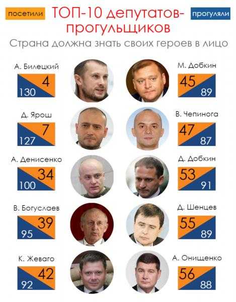 Рейтинг депутатов-прогульщиков возглавил нардеп вне фракции Андрей Билецкий. Отмечается, что из 134-х заседаний он принимал участие только в четырех. Кроме того, нардеп не комментировал свое отсутствие. Как известно, Андрей Билецкий является командиром полка «Азов», в результате чего часто находится в зоне АТО.