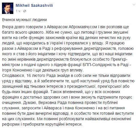 "Я долго вчера общался с Абромавичусом. И услышал от него много интересного. С ним я работаю в Совете по реформированию госпредприятий, на пост главы которого меня сагитировал лично Абромавичус. Все то, что мы предлагали по вопросам замены руководителей госпредприятий, лично блокирует премьер-министр. По указке одного из лидеров пропрезидентского Игоря Кононенко и еще нескольких групп влияния", - сообщил сегодня, 3 февраля в своем Facebook Михаил Саакашвили.